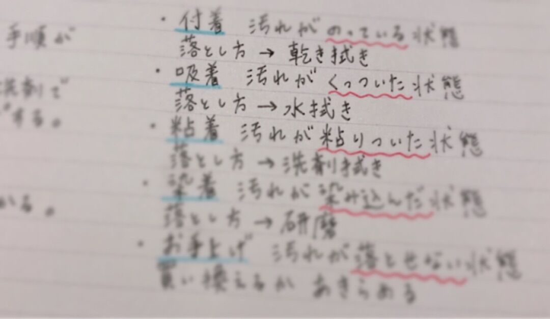 他にも、洗剤のpH値のことや、汚れの5つの段階のことなど、とにかくお掃除のアレコレをひたすら学びました。とても楽しい学習期間でした。