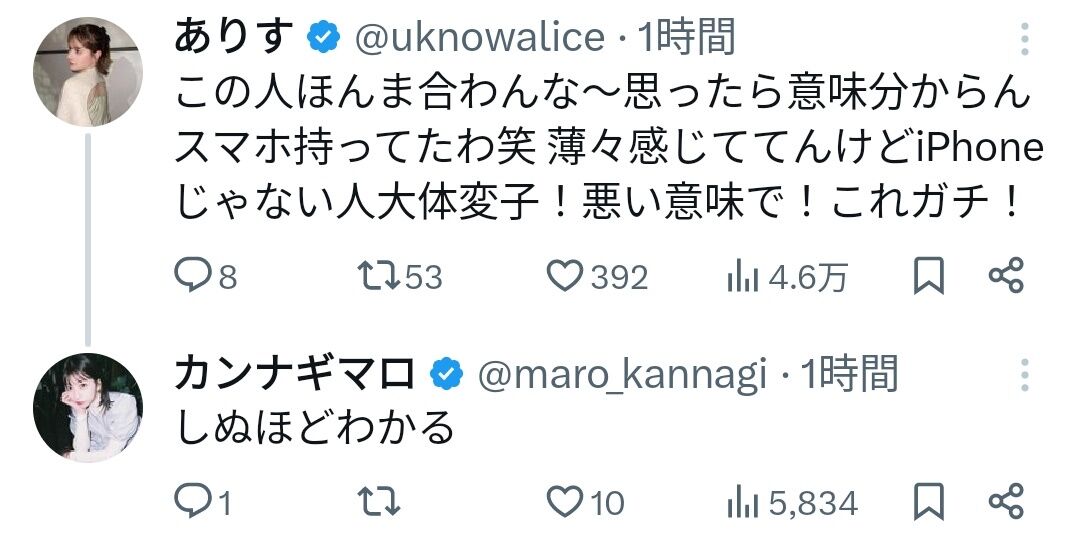 「iPhoneじゃない変なスマホ持ってるヤツ大体変人!悪い意味で!これガチ!」