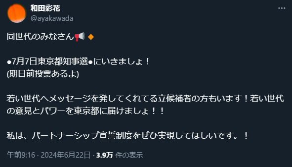 和田あやちょ「同世代のみなさん!東京都知事選にいきましょ!若い世代の意見とパワーを東京都に届けましょ!!」