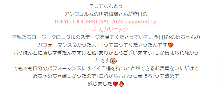で私たちロージークロニクルのステージを見てくださっていて、今日「ひのはちゃんのパフォーマンス良かったよ!」って言ってくださったんです🧡