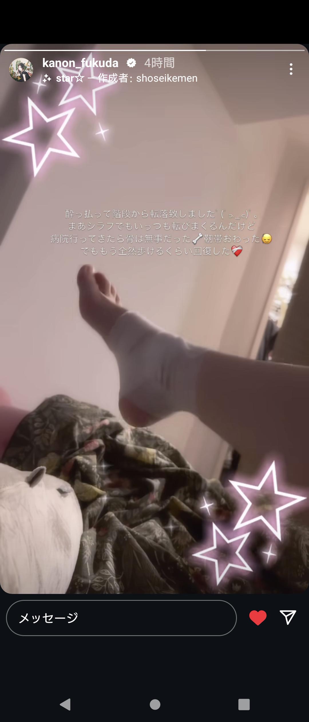 カンナギマロ様。酔っ払って階段から落ちて靭帯断裂。