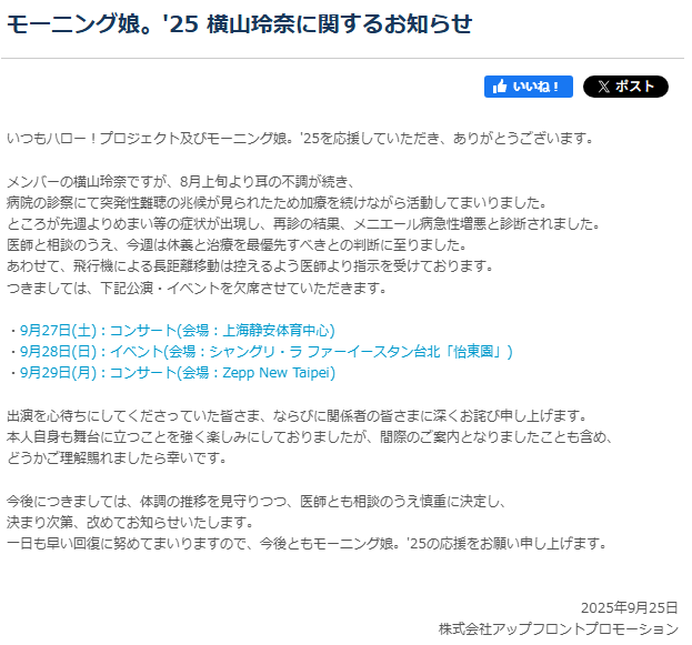 モーニング娘。'25 横山玲奈に関するお知らせ